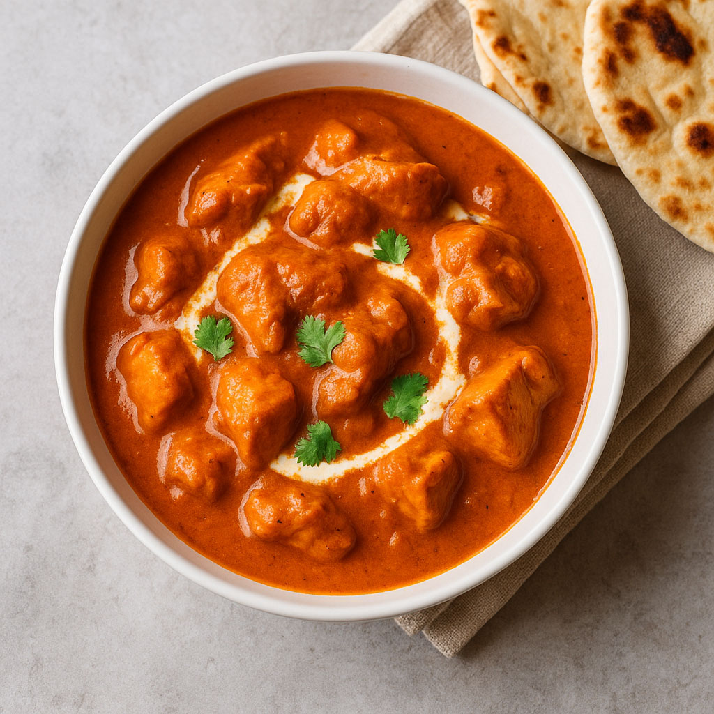 Creamy, aromatic butter chicken in a silky tomato sauce enriched with butter and cream. A restaurant favourite adapted for home kitchens — mildly spiced and delicious with naan or steamed basmati rice.